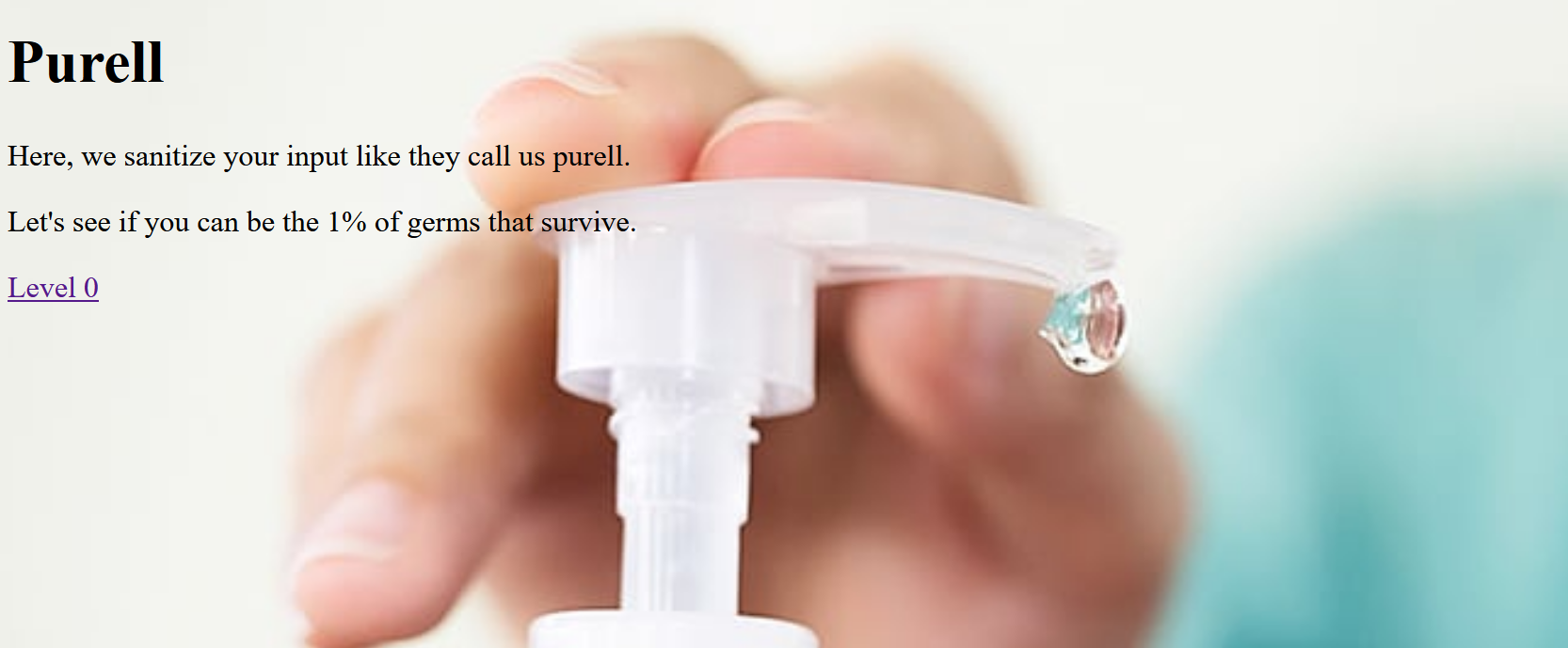 Description: Here in purellland, we sanitize your inputs. We kill 99% of germs, can you be the 1% germ that slips through?