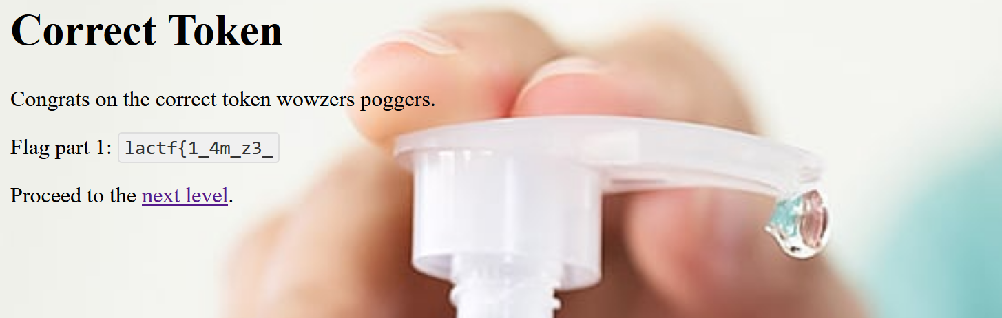 To solve Level 0, we can simply took the stolen admin token from my collaborator, paste it into the appropriate input field, and submit it. This grants access to website with part of flag.